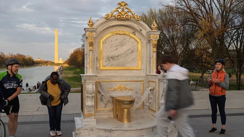 वॉशिंगटन के नेशनल मॉल पर सोने के टॉयलेट वाला एक बड़ा सिंहासन लगाकर व्हाइट हाउस के रेनोवेशन की अनोखे तरीके से आलोचना की गई है। नेशनल मॉल पर लगे इस सिंहासन को मार्बल और सोने जैसा बनाया गया है। सुनहरे टॉयलेट की मूर्ति एक संगमरमर के सिंहासन पर रखी है और इसका डिज़ाइन यूएस राष्ट्रपति डोनाल्ड ट्रम्प के ओवल ऑफिस के अंदाज़ जैसा नज़र आता है।